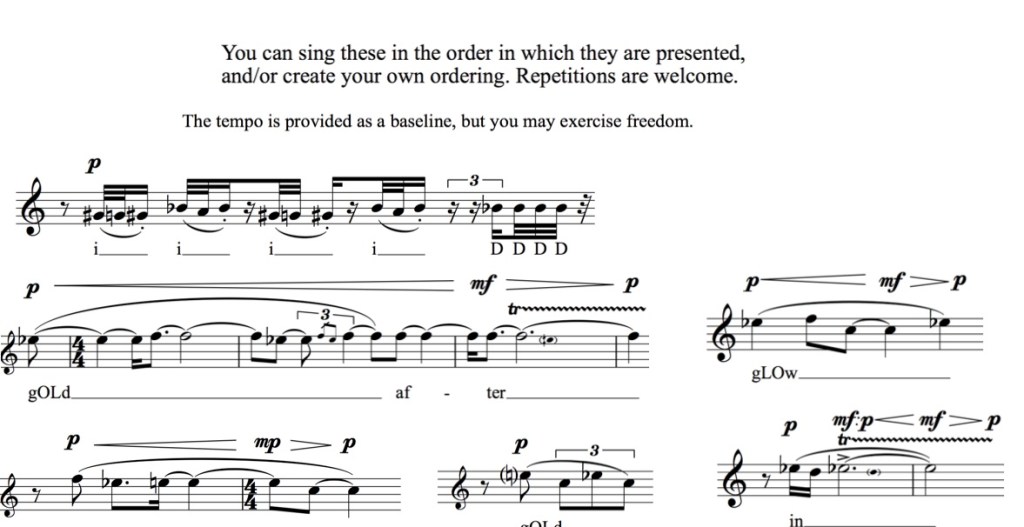 - Can/should there be a score? Would it be more appropriate to present the piece as independent parts that coincide in spontaneous and unpredictable ways? And as a corollary of this, what impact might such freedom between the lines present to performers? For example, harmonic reference points will be less predictable for the singer, in an indeterminate context.