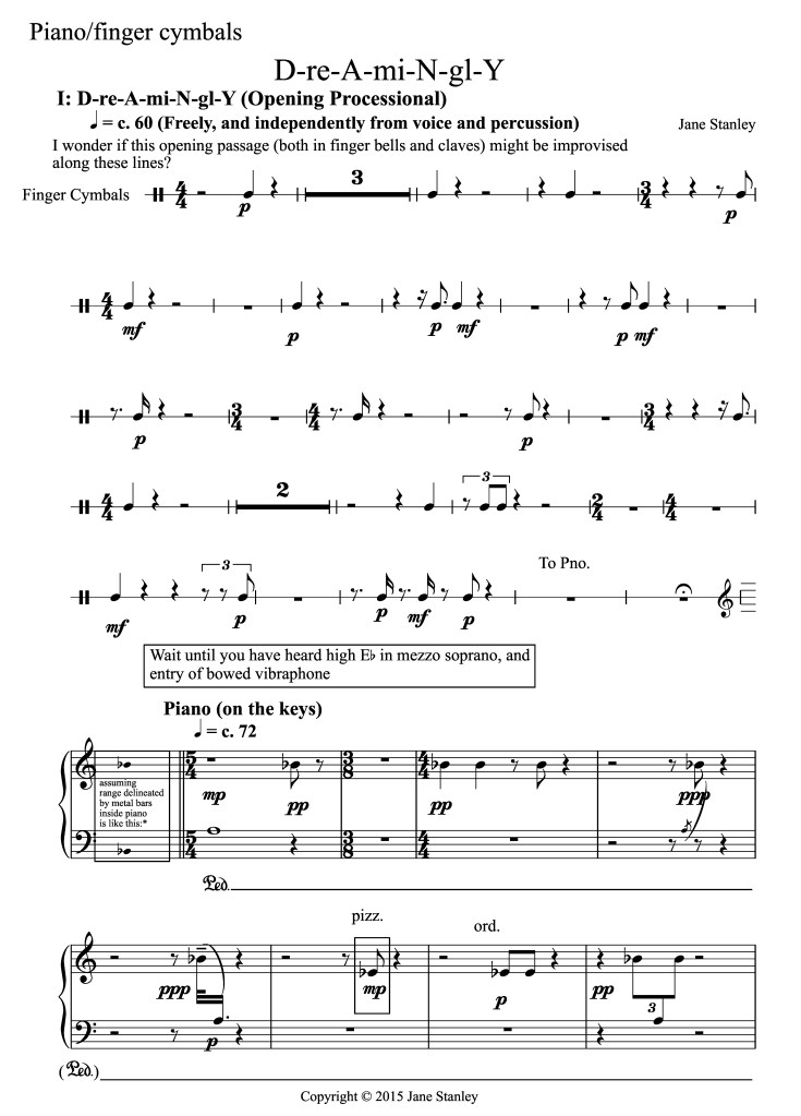 Regarding my approach to notating material for passages where the players are moving (and holding/playing portable instruments), I had not yet gone as far as assigning very open material (in the 2018 version I provide very short fragments that serve as a foundation for improvisation). Rather, I presented the pianist with the following part (for the passage where she plays finger cymbals):