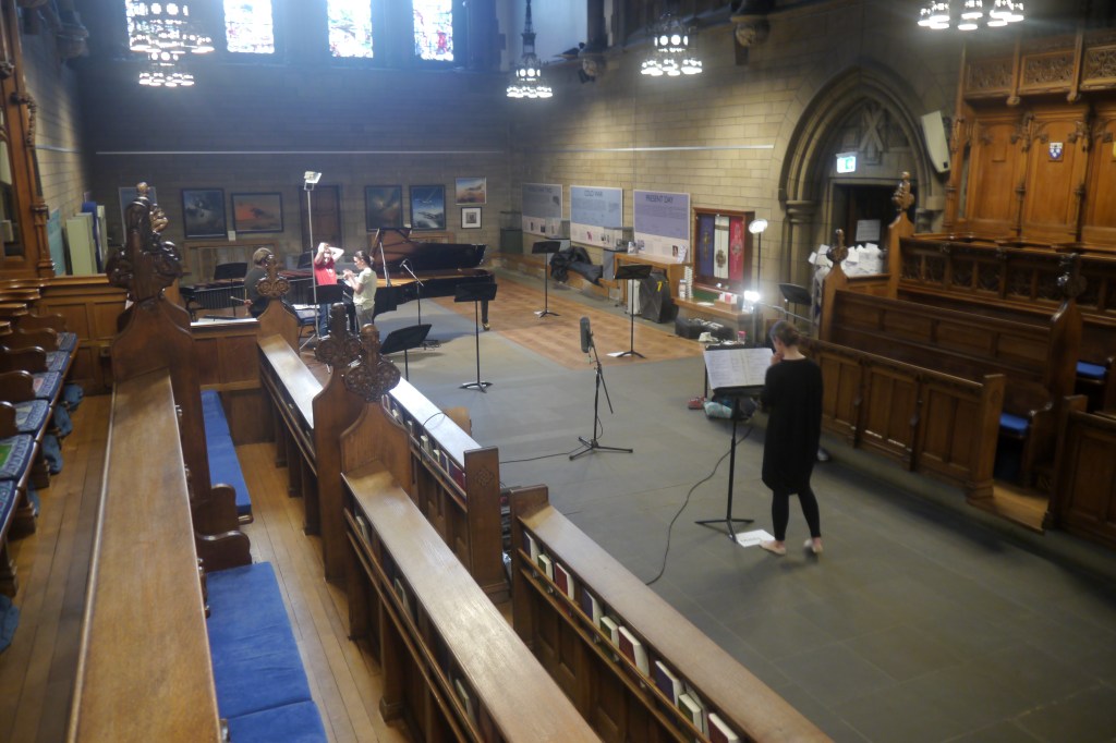 I had selected the Memorial Chapel at the University of Glasgow for its resonant acoustic. The recording was made using a Soundfield ST450 Surround Microphone. An obvious difference between its layout and that of Królikarnia Museum was its open plan. I nevertheless hoped that, given the size of the Chapel’s main internal space that there would be opportunities to explore different mixtures of presence and absence in the sonic image. There was also the potential to experiment with off-stage effects, by positioning players in the foyers of either side of the main room.