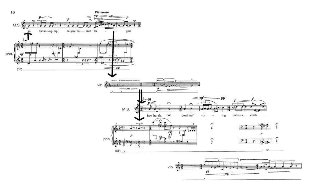 For reasons that I can only partly explain however, I opted not to pursue an indeterminate form. I think the fact that I had little previous experience with writing ‘open form’ music had something to do with this, as well as a self-imposed pressure to deliver a conventional linear score. Also in the background was a nervousness about writing music for voice, and a sensitive awareness of challenges faced by singers. I was acutely aware of (but at the same time) puzzled by how the mezzo soprano would successfully ‘find her notes’ in an open form piece, where the harmonic context around her lines would be different each time the piece was played. As an early test of a notational approach, I presented the following passage (to the percussionist and pianist) during my April trip: