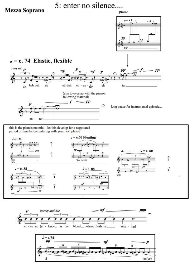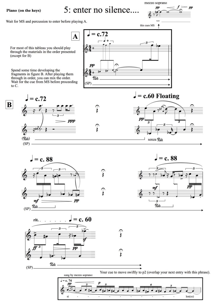 For the purposes of explaining my concept of socially-mediated composition process, I will focus on tableau 5 (“enter no silence”). In the recording of this piece, this section commences at 12’51”. In contrast to the first and last tableaux where only a minimal amount of notated material is presented, here in V: “enter no silence”, everything is fully written out, but decisions about precise alignment between the three players’ parts was left open until we met to workshop material.
