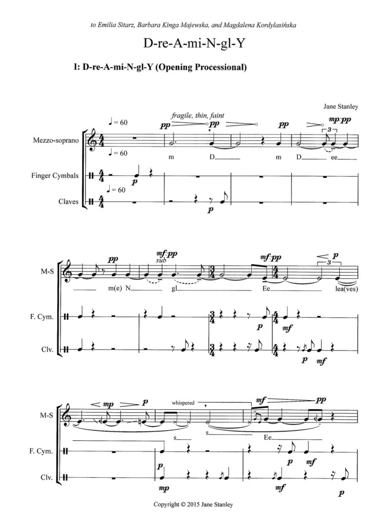 The context of the 2015 commission led to me focussing on space as a primary concern. I was asked by pianist Emilia Sitarz to compose a work of c.13 mins duration for herself with mezzo soprano (Barbara Kinga Majewska) and percussion (Magdalena Kordylasińska). Part of the brief for this commission was to compose a piece that enabled the performers to move to different locations in the performance space. Emilia sets out the key elements of this commission in an email from 24 November 2014: