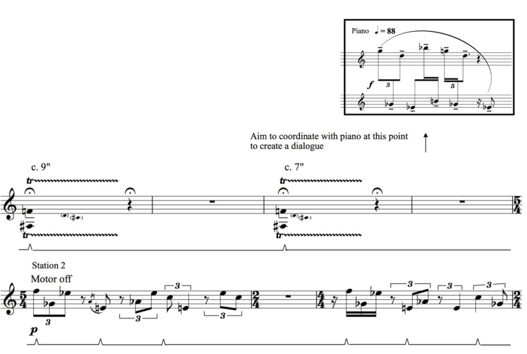 One way that I responded to the aim of incorporating a greater degree of indeterminacy was by assigning less prescriptive material to the players for the sections where the pianist and percussionist are mobile. Here the percussionist, playing claves, is provided with a set of indicative cells, to be used as a springboard for improvisation. And at the bottom right corner of this part you can see an example of a very simple cue that the percussionist listens for to trigger the move to her next page.
