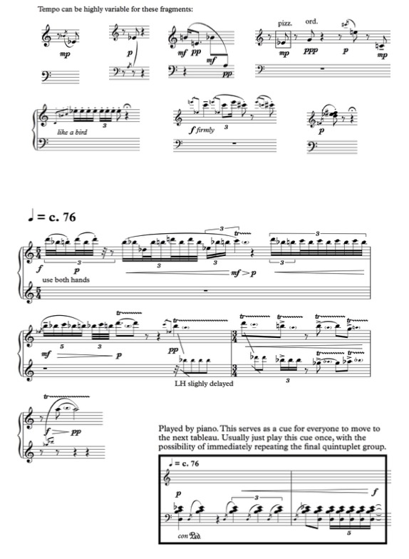 I will continue to use same notational approach that I had done in D-re-A-mi-N-gl-Y. The structure of the piece overall is organised around 7 sections – I think of these as 7 ‘containers’ of material consisting of cells and melodic phrases which performers are requested to play in free order, and cues are used to trigger progress from one section to the next.