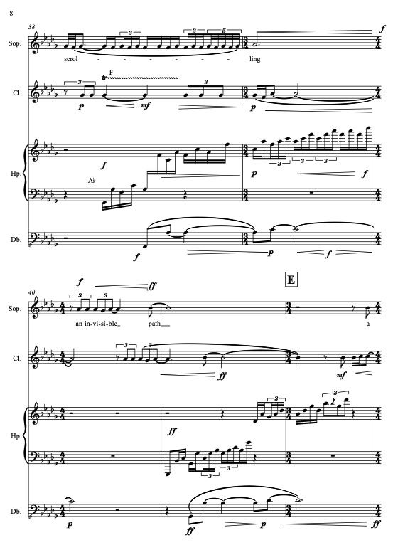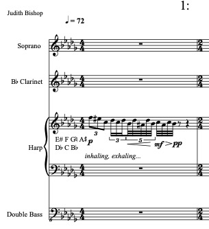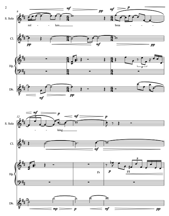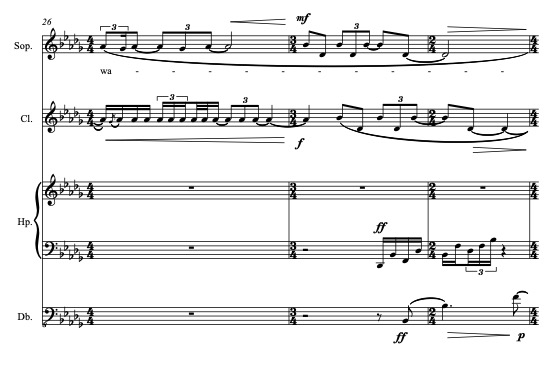 The instrumentation for the piece is soprano, Bb clarinet (doubling on bass clarinet), harp and double bass, and the overall anticipated duration will be c. 15 minutes.