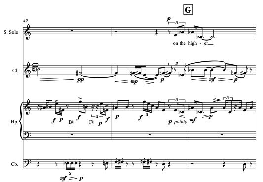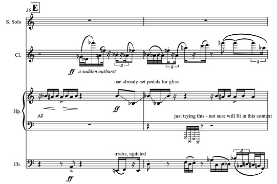 Another, more radical, revision might would be to employ bass clarinet in this song, building lines that reinforce resonance projecting from the double bass and harp (for example, at bar 27-28, the bass clarinet could perhaps play a low Db). This could sound really beautiful (but at the cost of eliminating some of the imitative writing) so I’m currently weighing up these options in the course of preparing the final version.